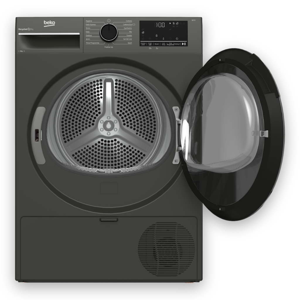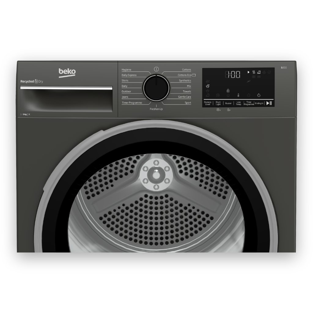 Drying Capacity: 9 kg Energy Efficiency Class: B Drying Technology: Condenser Sensor Drying: OptiSense Noise Level: 65 dBA AquaWave Drum Technology Digital Display Drum Light (DC LED) 15 Programmes incl. Cottons, Sports, Towels, Jeans, Hygiene+ Reversible Transparent Door Freestanding Construction Manhattan Grey Finish