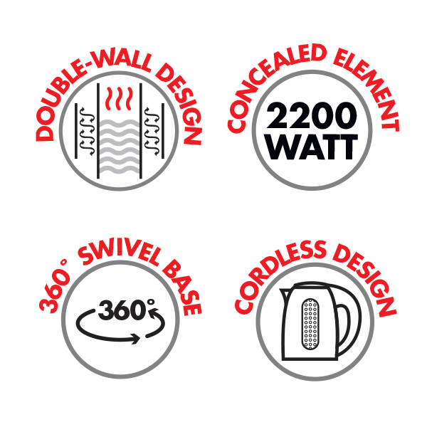 Let off some steam with the Bennett Read 1.7 L Cool-Touch Kettle! Designed with a powerful 2200 W concealed heat element and double-wall construction featuring a stainless steel inner, it ensures boiled water stays hotter longer while keeping the exterior cool to the touch (note that stainless steel accents may still be hot during boiling). The safety-lock lid, auto shut-off, and boil-dry protection enhance peace of mind, and its cordless 360° swivel base with integrated cord storage makes it as practical as it is stylish. Key Features Large 1.7 L capacity Powerful 2200 W concealed heat element Boil-dry protection and auto shut-off Premium European-inspired design Double-wall construction that retains heat while keeping exterior cool* Cordless design 360° swivel base Integrated cord storage Quick-release 90° lid with secure safety-lock *Stainless steel accents will be hot during boiling process Material Used Inner stainless steel lining (double-wall) Exterior stainless steel and plastic components Hidden metal heating element Plastic safety-lock lid and quick-release mechanism