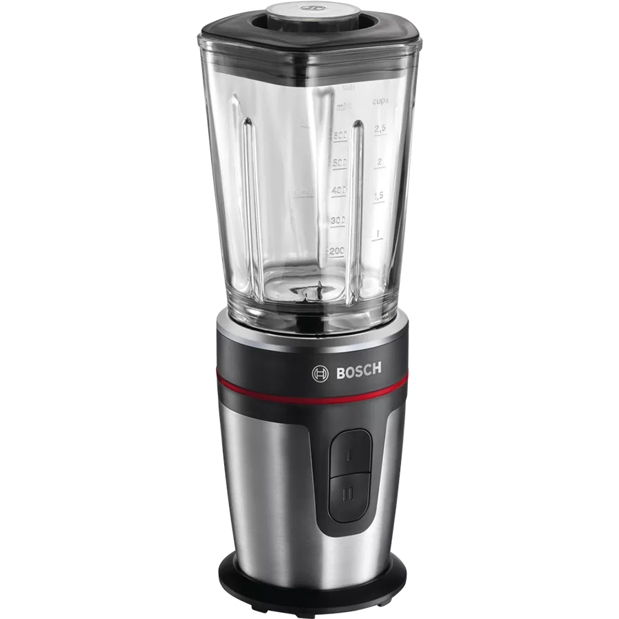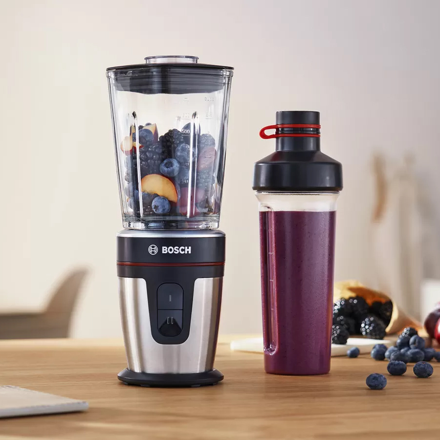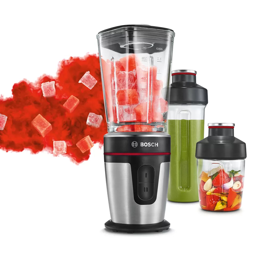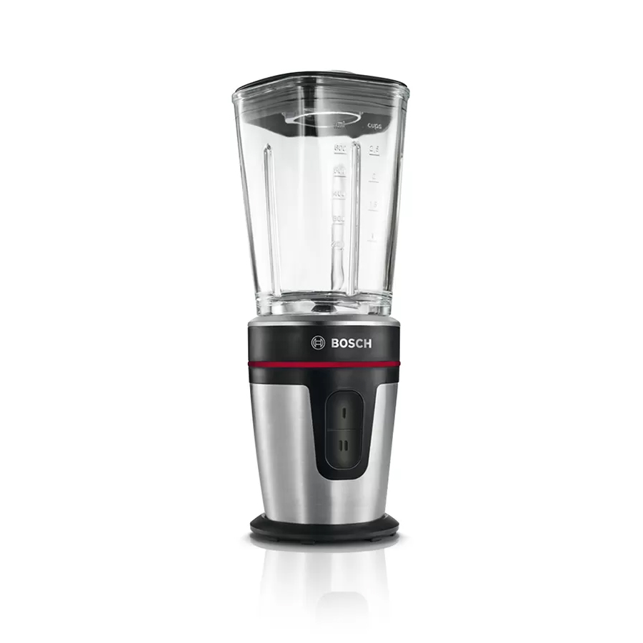 The Bosch Stainless Steel liquidiser has a 350W motor and 2-speed settings, with its high-quality thermo-safe glass and removable stainless steel knife you will be able to prepare the most delicious smoothies and mixtures. The set comes with a ToGo Blender cup and a universal shredder that is shatterproof, taste and odour free as well as BPA-free. The removable stainless steel blade is easy to clean and so are all other items in the Bosch liquidiser, the glass jug, lids and accessories is dishwasher safe. Additionally, the blade is suitable for mixing, blending, chopping and for use on ice cubes and frozen fruits.
