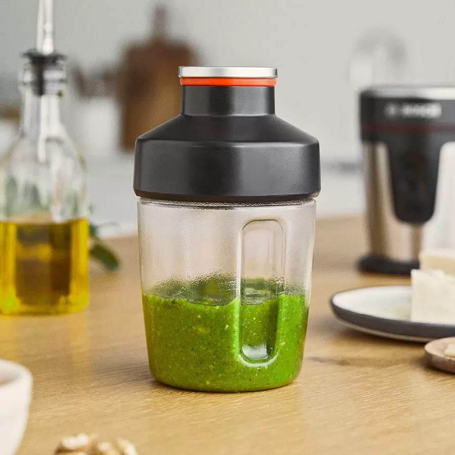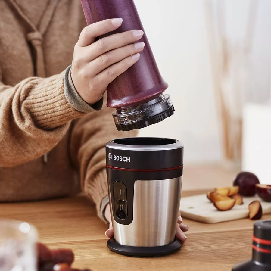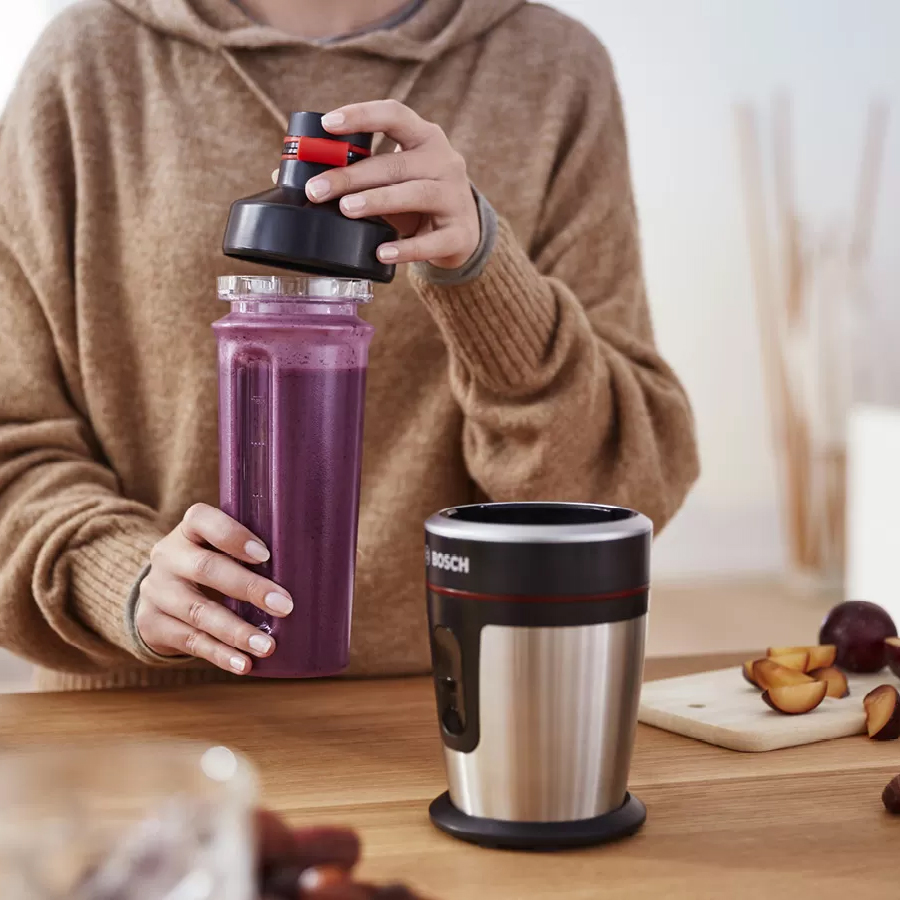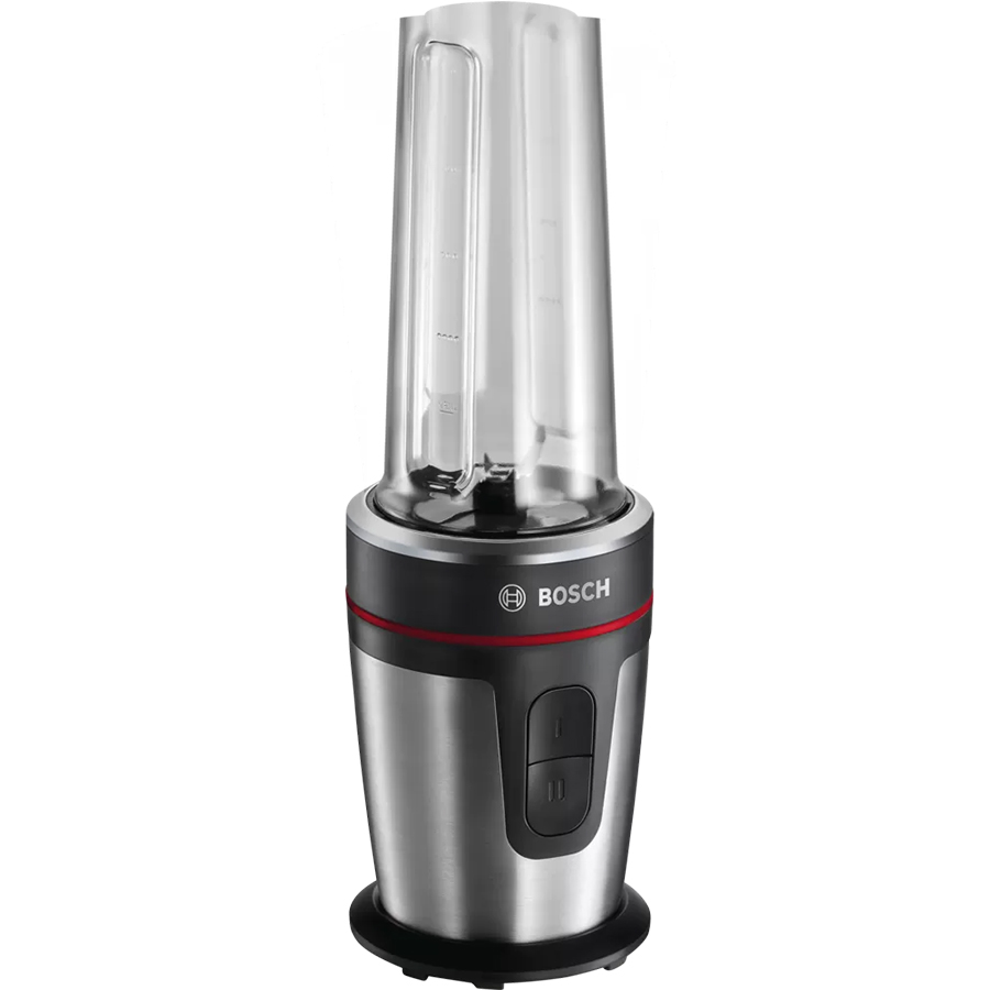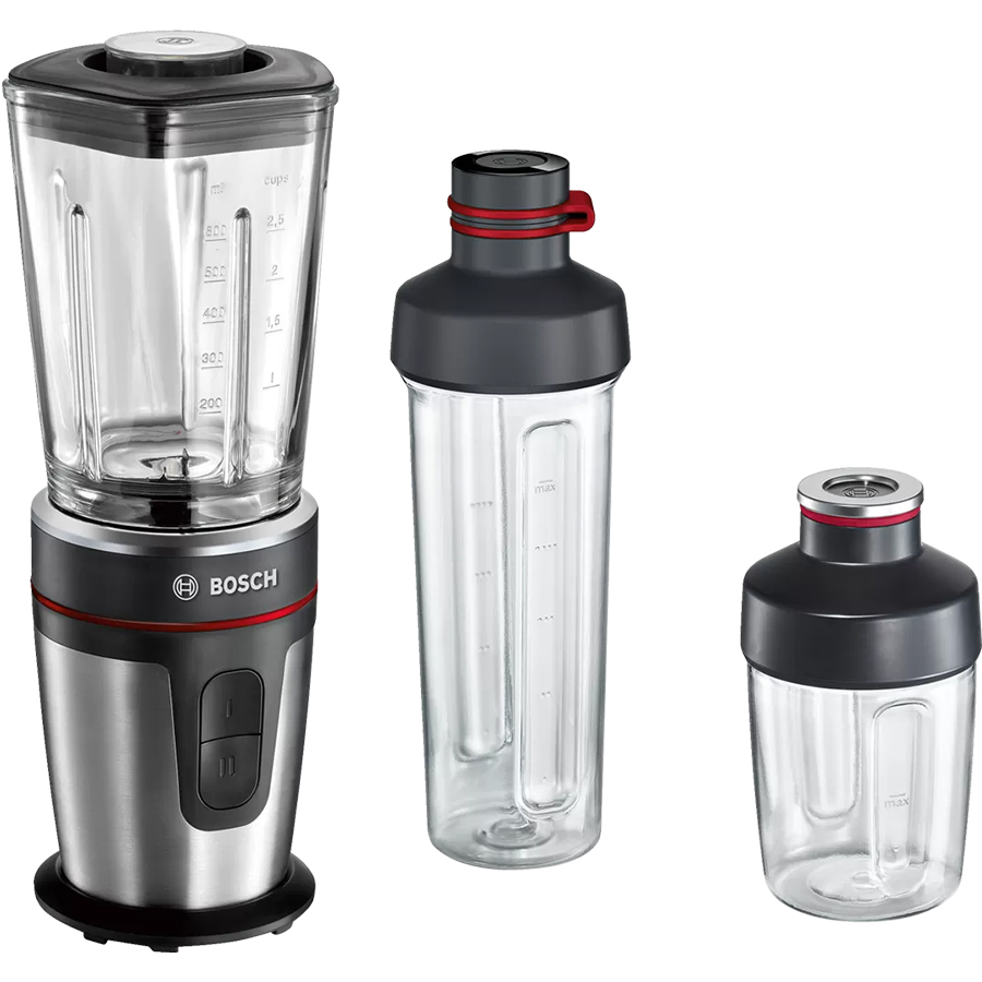 The Bosch Stainless Steel liquidiser has a 350W motor and 2-speed settings, with its high-quality thermo-safe glass and removable stainless steel knife you will be able to prepare the most delicious smoothies and mixtures. The set comes with a ToGo Blender cup and a universal shredder that is shatterproof, taste and odour free as well as BPA-free. The removable stainless steel blade is easy to clean and so are all other items in the Bosch liquidiser, the glass jug, lids and accessories is dishwasher safe. Additionally, the blade is suitable for mixing, blending, chopping and for use on ice cubes and frozen fruits.