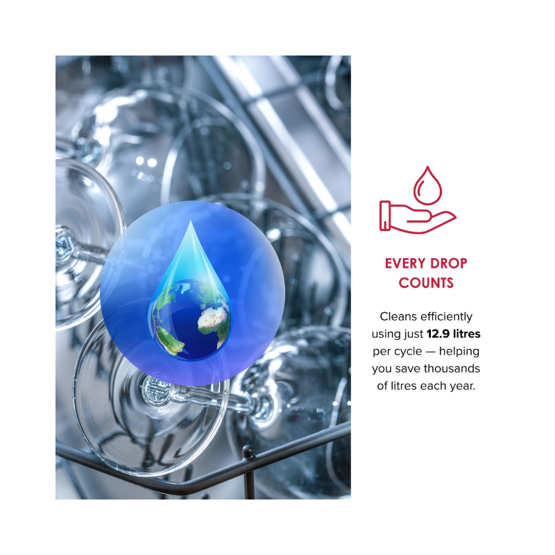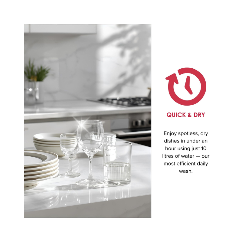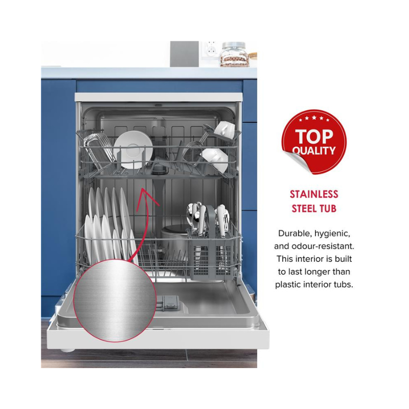 With an A++ energy rating and water consumption of just 12.9L per cycle, the DDW240 helps reduce running costs while delivering dependable cleaning results. Operating at a 53 dBA noise level, it provides effective cleaning with minimal disruption, making it suitable for daily use in busy households. The robust spray arm ensures thorough water distribution, while the stainless steel tub offers long-lasting, hygienic performance.