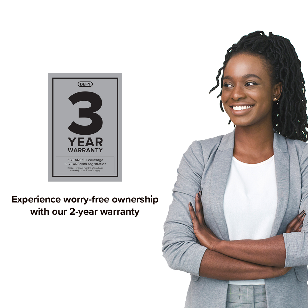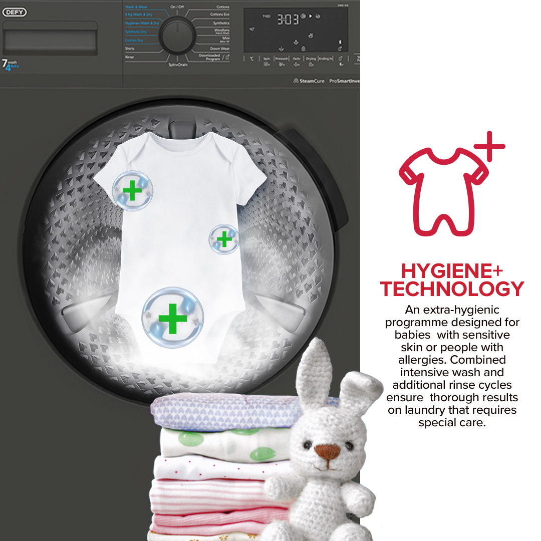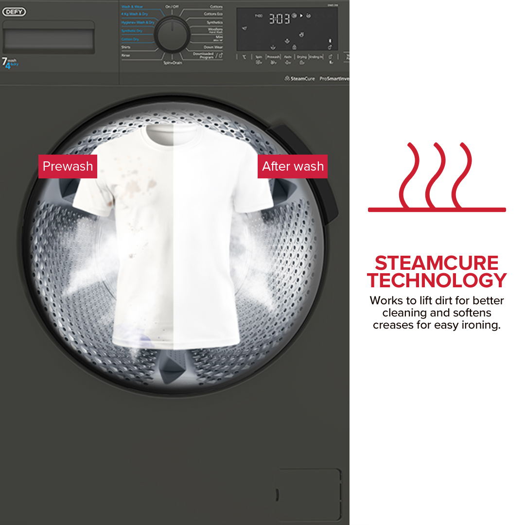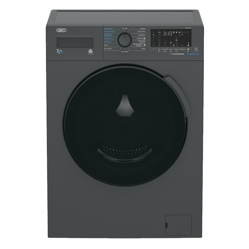 The Defy 7/4kg SteamCure™ Washer Dryer is the ultimate saver in terms of time, space, money, and energy. Combining Defy’s superior front loader washing machine technology with its tumble dryer technology, all your laundry needs will be met in this compact device. And Defy has gone even further by including its innovative SteamCure™ technology, which means even the toughest stains and strongest odours are eradicated by the burst of steam. And, once a cycle is nearing completion, a final burst of steam softens creases for quick and easy ironing – if at all! For a washer/dryer that truly cares for your fabrics, and the environment, this is the one to get.