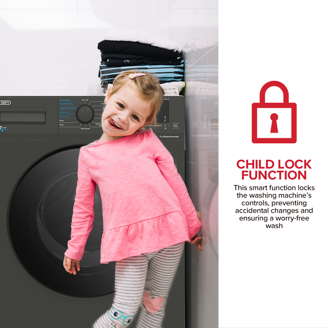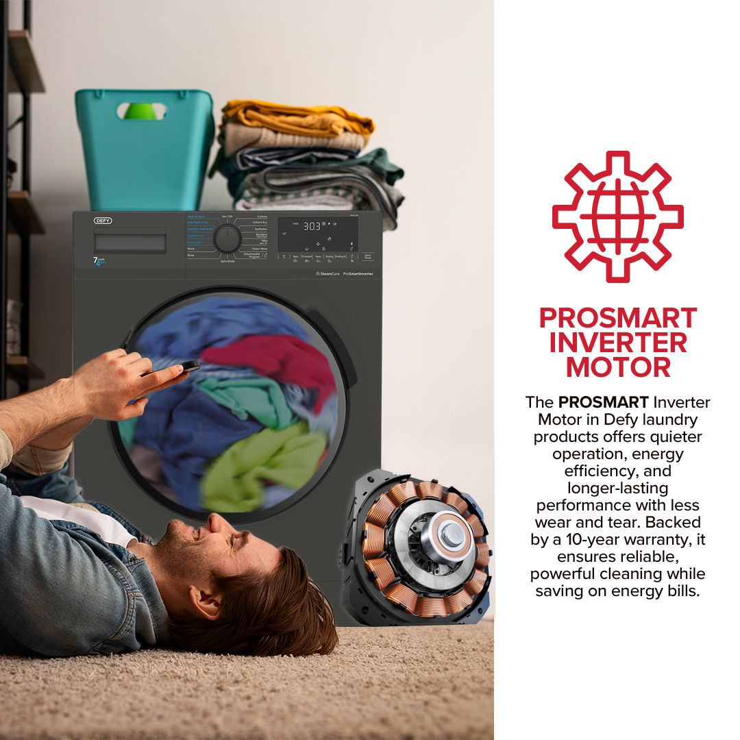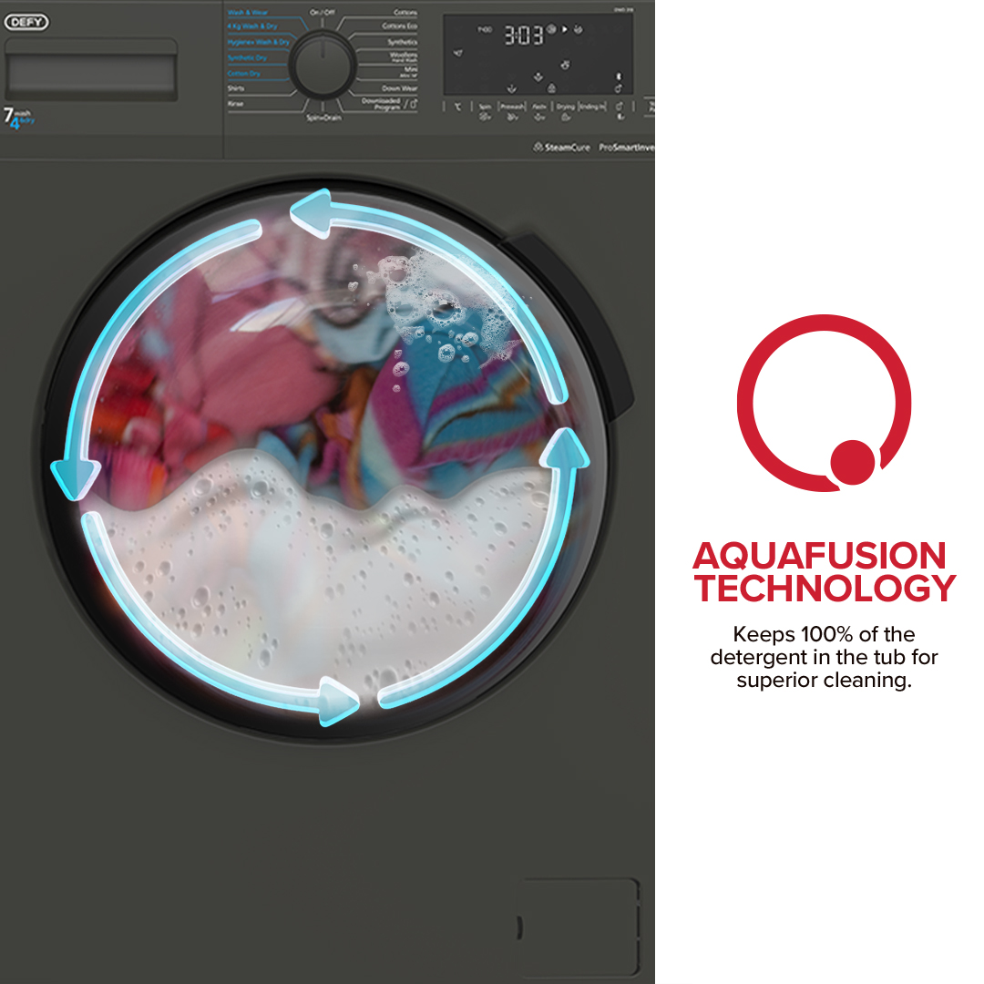 The Defy 7/4kg SteamCure™ Washer Dryer is the ultimate saver in terms of time, space, money, and energy. Combining Defy’s superior front loader washing machine technology with its tumble dryer technology, all your laundry needs will be met in this compact device. And Defy has gone even further by including its innovative SteamCure™ technology, which means even the toughest stains and strongest odours are eradicated by the burst of steam. And, once a cycle is nearing completion, a final burst of steam softens creases for quick and easy ironing – if at all! For a washer/dryer that truly cares for your fabrics, and the environment, this is the one to get.