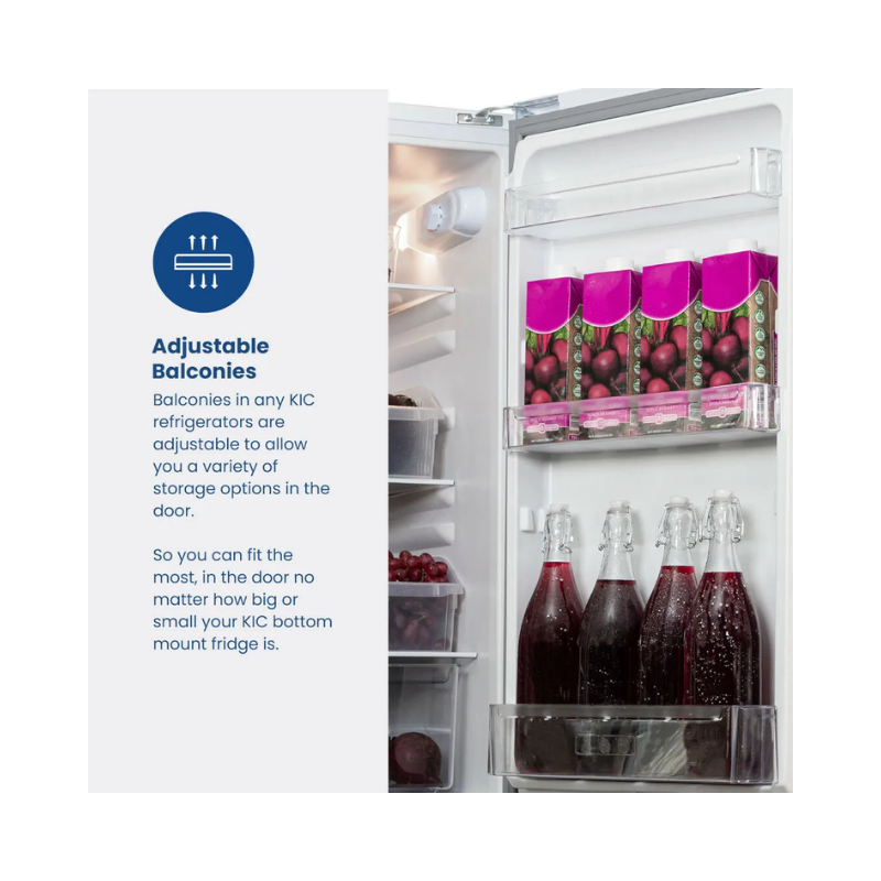 Combining style with function, the KIC KBF 631/2GR in dark grey brings a modern look to kitchens while delivering generous storage: 193 L for fresh goods and 83 L for frozen items. Its bottom freezer design makes accessing fresh food easier, while the large “Big Balcony” accommodates upto four large bottles and adjustable balconies let you tailor space. Toughened glass shelves, a crisper drawer, semi-auto defrost and direct cooling ensure your food stays fresh and your maintenance is minimal.