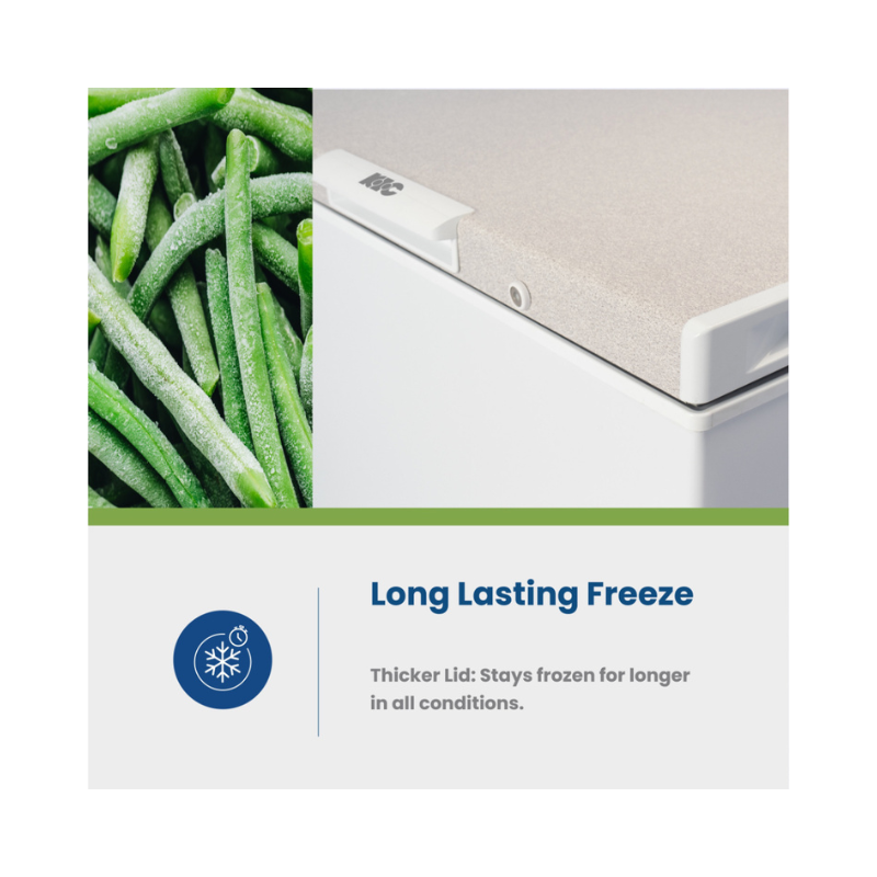 Designed for households needing substantial frozen storage, the KIC KCG305WH chest freezer delivers about 279 L of usable capacity within a durable aluminum interior that resists rust and is easy to clean. With its scratch-resistant, food‐safe worktop and robust lid, it’s built for tough environments and heavy use. The freezer operates reliably in ambient temperatures up to 43 °C, includes a secure lock, and features vari-freeze controls so you can adjust between freezing, chilling, or cooling as needed. It is finished in white, with a strong build quality that ensures long-term performance.