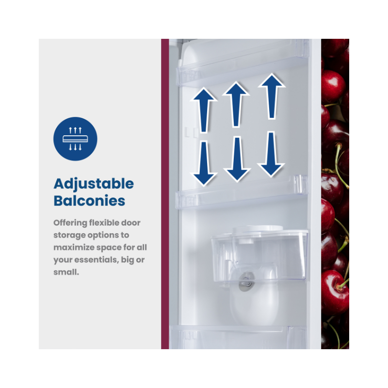 It has a large “big balcony” door shelf that fits up to four 2.25–2.5 L bottles. It uses direct cooling technology for efficient temperature maintenance. It includes an anti-bacterial / bacteria-stop seal to help maintain hygiene.