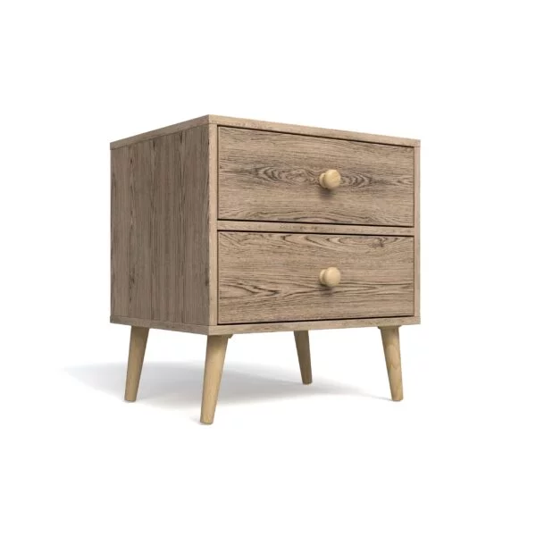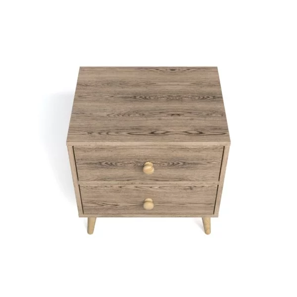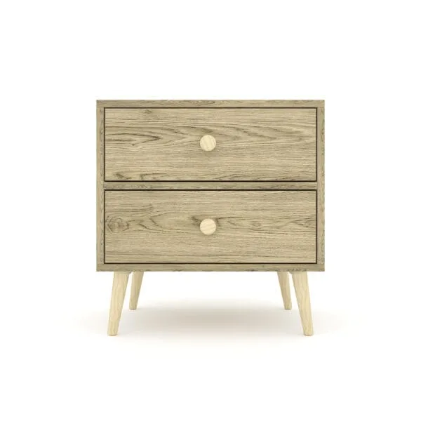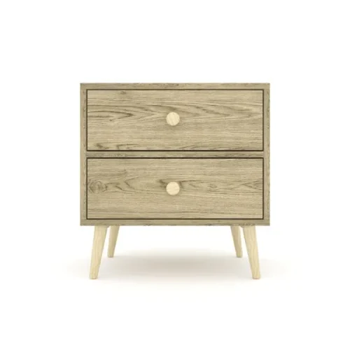 Crafted with a premium Alegria textured melamine finish, and complemented by unfinished rustic pine legs and handles, this piece offers a balanced blend of modern utility and natural warmth. The two spacious drawers glide smoothly on ball bearing runners, keeping all your nighttime essentials organized and within easy reach.