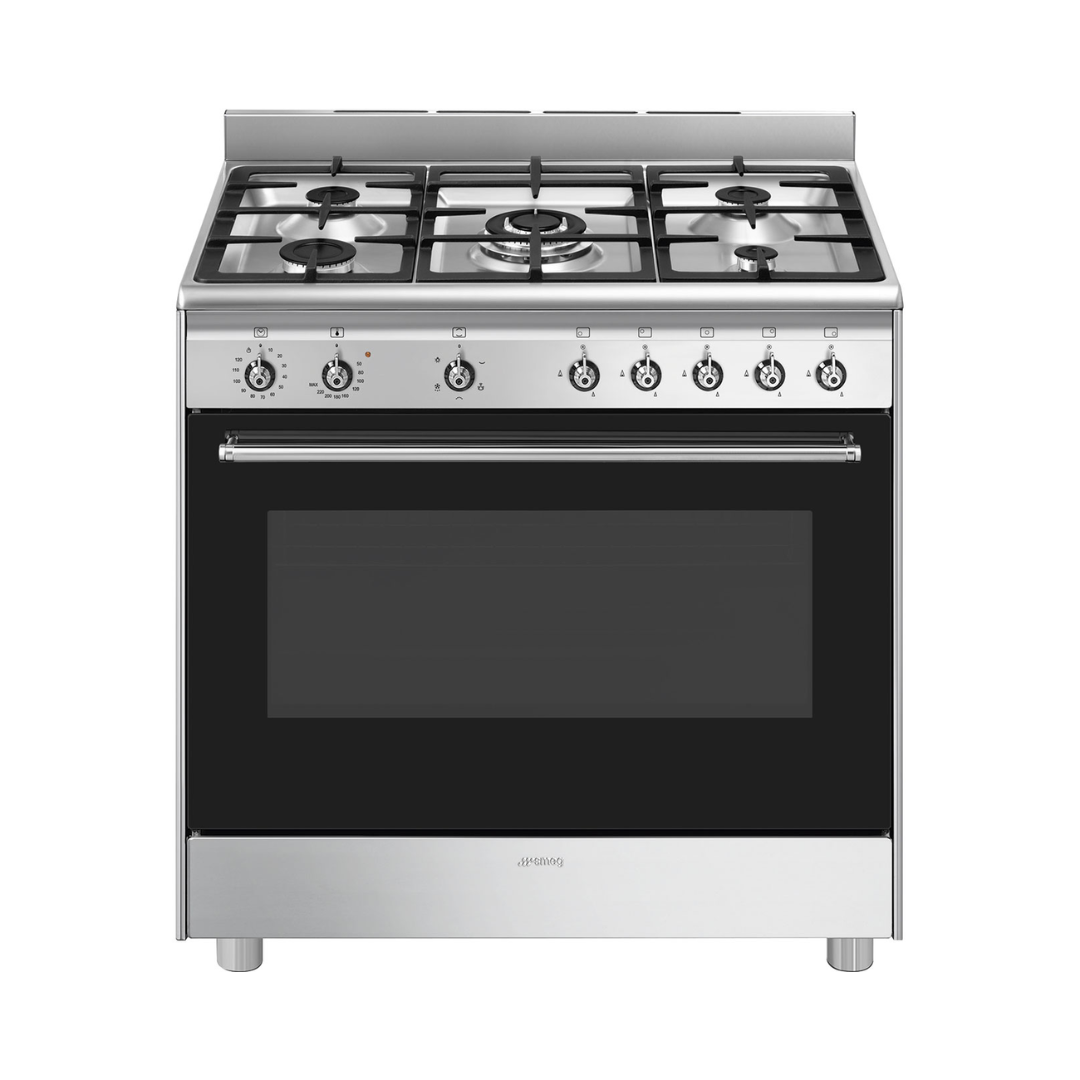 Designed to meet the demands of serious home cooking, this SMEG Classica 90 cm full-gas cooker combines a spacious twin-fan gas oven and powerful five-zone gas hob with the refined stainless-steel finish and cast-iron pan supports of the Classica line. With multiple cooking levels, gas-safety features, halogen lighting, and a cooling airflow system, it ensures both high performance and a premium aesthetic. Whether you’re braising, roasting or simmering, this appliance provides control and style in one.